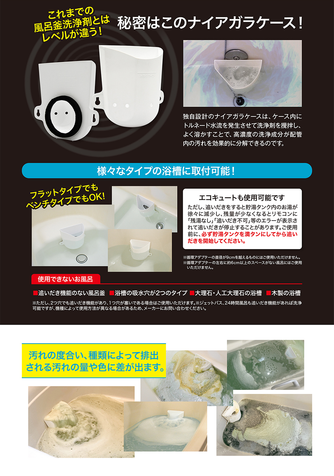 2刀流洗浄で風呂釜の奥から湯ドロがドバドバ!専用ケースで高濃度洗浄、水垢も皮脂汚れもごっそり落ちて爽快。スッキリ気持ちよく入浴できます。