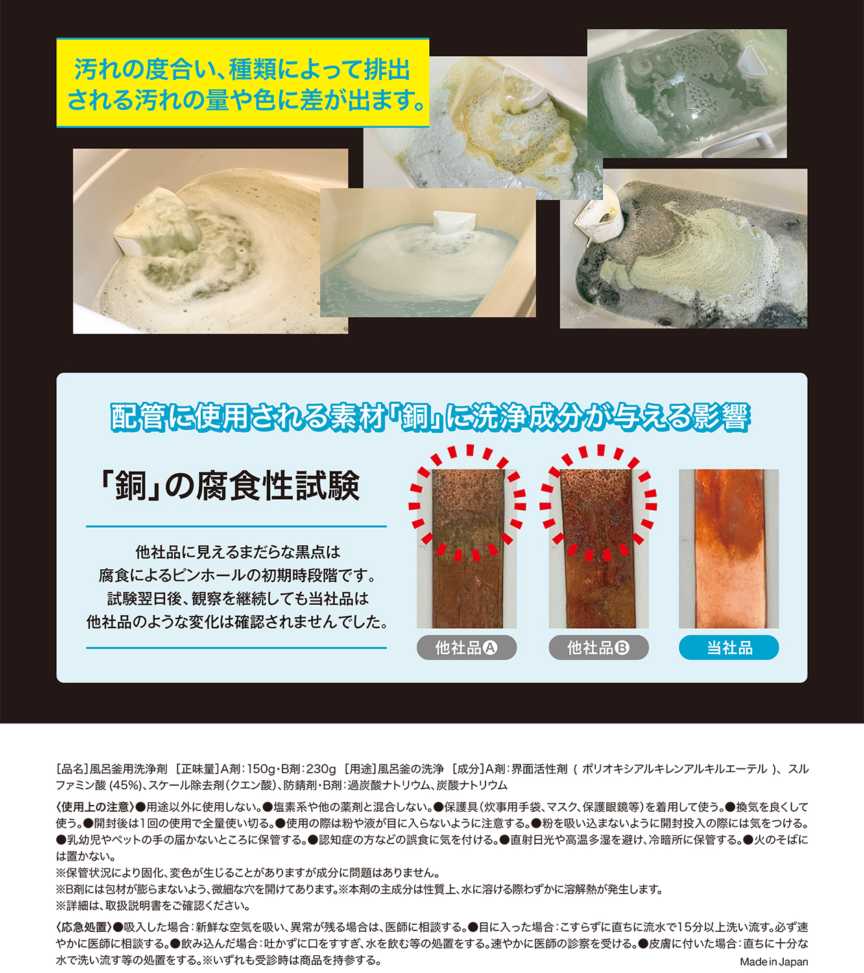 2刀流洗浄で風呂釜の奥から湯ドロがドバドバ!専用ケースで高濃度洗浄、水垢も皮脂汚れもごっそり落ちて爽快。スッキリ気持ちよく入浴できます。